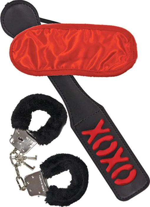 Uppfyll dina önskningar med SWEET PUNISHMENT bondage kit. Med mjuka handbojor, en röd mask och en XOXO-piska är det för att utforska fantasier.