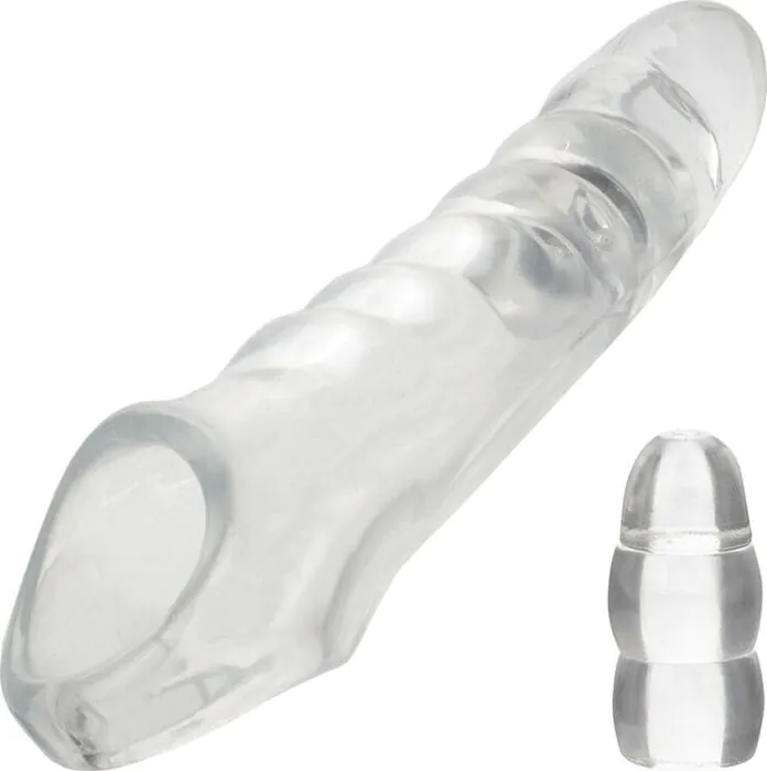 Let me explain this like I would in the shop: the CALEXOTICS Maxx is a clear, elastic penis extender sleeve designed to add both length and girth during partnered sex. The end features an ultra-soft, solid head 3.75" / 9.5 cm long so the added length is tangible and cushioned. Because the sleeve is hollow and stretchable it fits over your shaft, while the integrated scrotum strap improves stability during movement. Three removable stoppers let you tailor how far the sleeve sits, helping with comfort and hold.