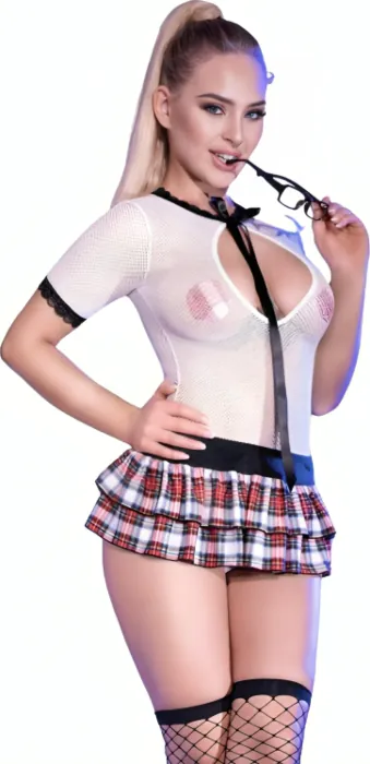 Steg in i en fascinerande roll med denna skoluniform som kombinerar förförelse och lekfull oskuld. Tillverkad av mjukt vitt nät framhäver bodyn din silhuett, medan de delikata spetsdetaljerna ger en feminin touch. Enskildelement är en djup urringning, en svart fluga och en kort plisserad kjol med ett klassiskt rutmönster som vackert lyfter fram dina ben.