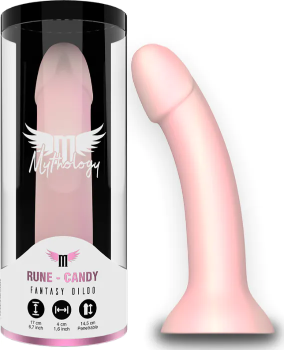Dildo Mythology Rune Candy är skapad av mjuk, kroppssäker silikon och är för både solo- och paranvändning. Den starka sugapparaten ger en säker och mångsidig användning. Med en total längd på 17 cm och en insättningslängd på 14,5 cm samt en bekväm diameter på 4 cm är den ett bra tillskott till din samling.
