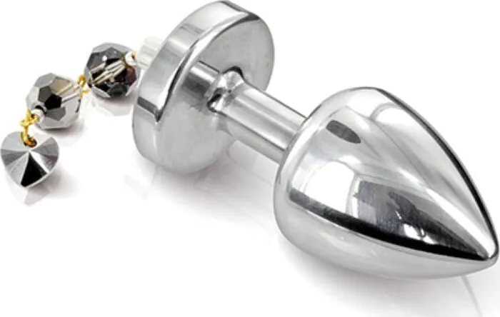 Detta är en analplug i rostfritt stål som är designad som ett smycke — en slät, konisk plugg med ett dekorativt hänge i änden. Den passar för någon som vill ha en fast, icke-porös leksak som glider in lätt och kan kylas eller värmas för extra känslor. Metallen ger en märkbar vikt jämfört med silikon, och den helt rundade spetsen och den polerade ytan gör insättningen skonsam.