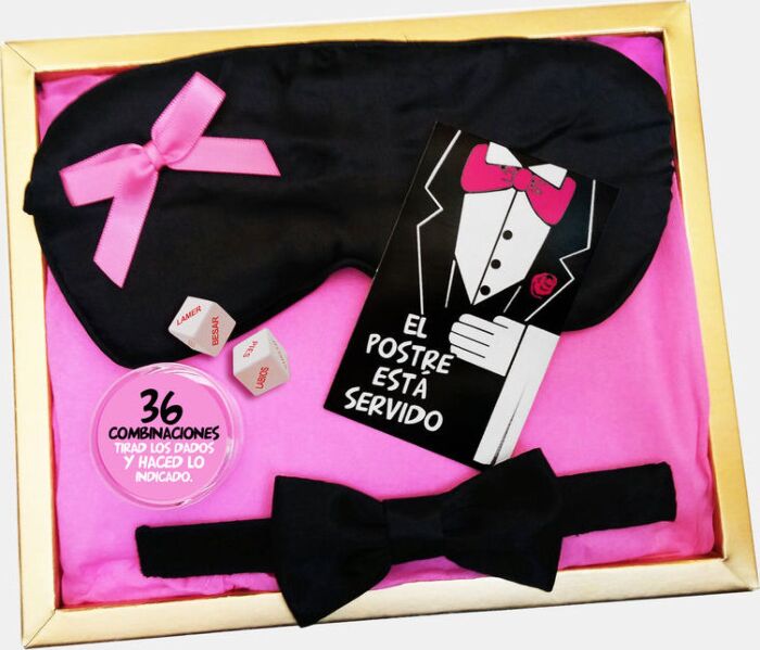 INEDITs erotiska kit inkluderar en ögonbindel, ett spel med två tärningar som erbjuder 36 olika kombinationer, och en fluga för honom. Det är utformat för lekfull interaktion mellan par.