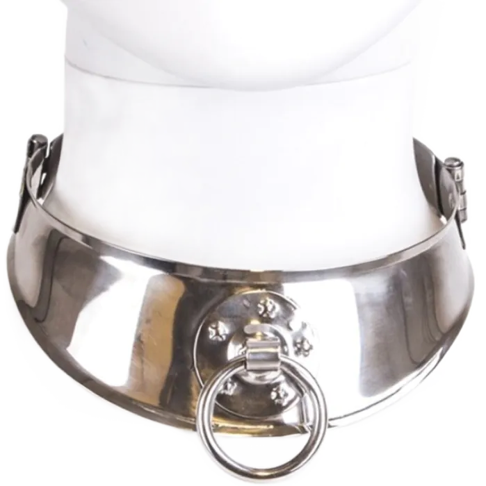Denna stiliga fängselkrage av rostfritt stål är både hållbar och estetiskt tilltalande, för BDSM eller fetishlek. Gör ett statement med stil.