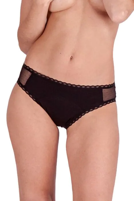 Underkläder designade för lätt till normal mensflöde. Tvättbara och andas, med förstärkt panel som sträcker sig från intimdelen till ländryggen för extra skydd. Bra val för miljövänliga, återanvändbara trosor.