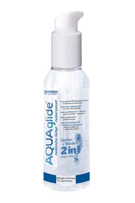 Upplev förförelse och komfort med JOYDIVISION AQUAGLIDE's 2 i 1 glidmedel och massagegel. Praktiskt för att förbättra intimitet och avkoppling.