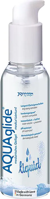 Ett mycket flytande, hudvänligt glidmedel från JOYDIVISION AQUAGLIDE i en 125 ml flaska. för vaginalt, analt och oralt bruk, sprider sig lätt och ger en fuktigare känsla än tjockare geler.