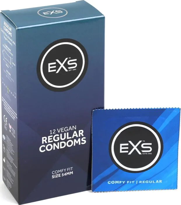 Exs Regular kondomer är framtagna av naturlatex för en mjuk känsla. Med en nominal bredd på 54 mm och en längd på 192 mm är de ett mångsidigt val för en bekväm passform. Den anatomiska, flareade formen som är bredare vid glans och har en reservoartopp säkerställer trygghet och komfort under användning.