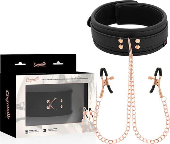 Upplev säker lek med denna veganska läderkrage som har justerbara bröstvårtklämmor. Passar både nybörjare och fetischentusiaster.