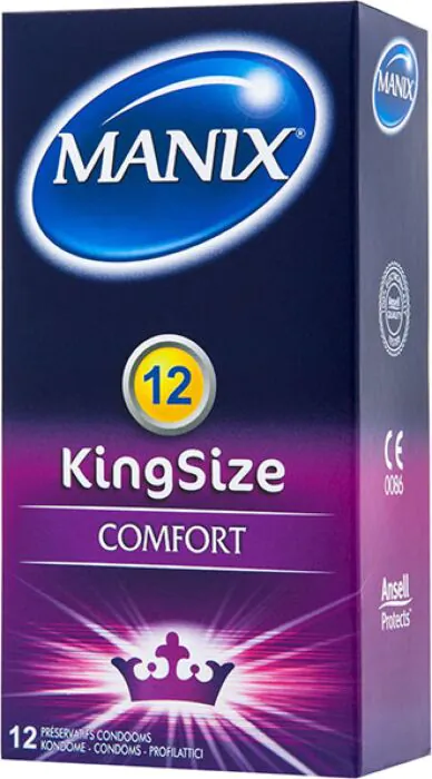 Manix King Size är latexkondomer i ett 12-pack, designade för den som upplever att standardkondomer känns trånga. De erbjuder en rymligare passform med 56 mm nominell bredd och lätt smörjning.