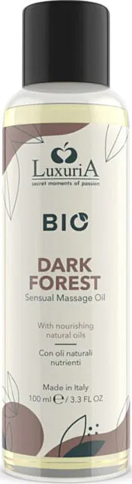Intimateline Luxuria's BIO Mörk Skog massageolja ger intensiv återfuktning och en angenäm doft. Denna vårdande blandning av helt naturliga vegetabiliska oljor och raffinerade stimulerande essenser gör huden mjuk och lätt parfymerad.