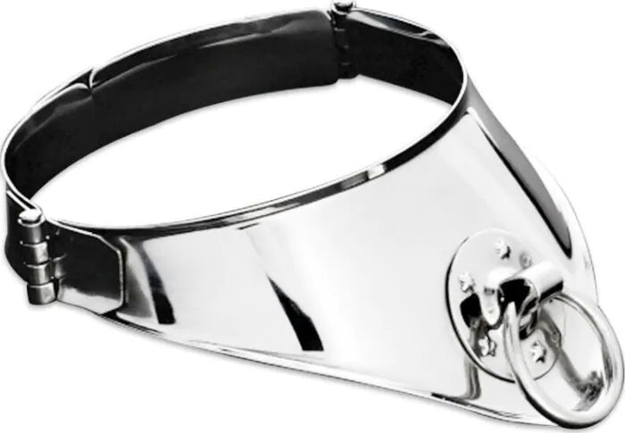 Detta är ett rigitt, låsbart fängelsehalsband som är tillverkat av rostfritt stål med förzinkade mässingsdetaljer. Det fungerar som en tydlig symbol för kontroll eller som en stark detalj i fetishwear, kostymer eller klubboutfits. Halsbandet är lätt och har mjuka kanter för ökad komfort, och dess design betonar en klassisk, spetsig framsida. Det som gör det speciellt är de laterala gångjärnen som öppnas utåt för enkel på- och avtagning, samt ett bakre hål för hänglås och en främre ring för att fästa en ledare eller ankare.