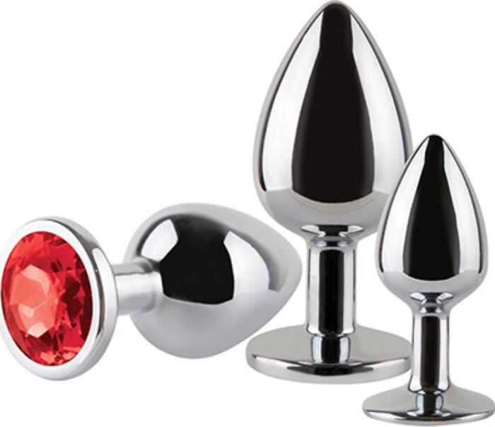 Ett tre-dels set av släta metallanalpluggar för gradvis progression. Varje plugg har en spetsig form och en platt bas, idealiskt för nybörjare som vill utforska fasta leksaker.
