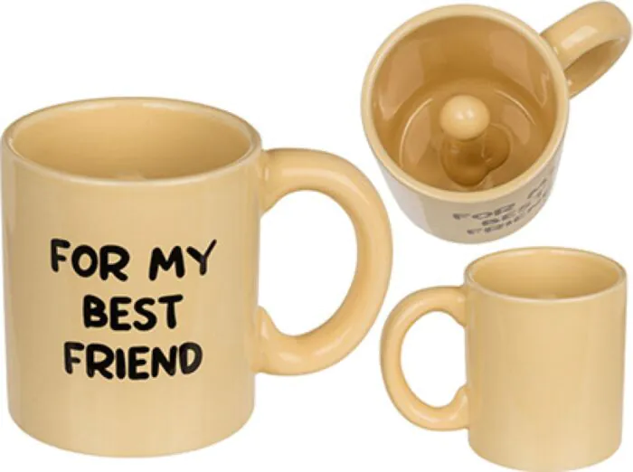 Denna roliga keramiska mugg ser vanlig ut tills du dricker klart. Med en gömd, skulpterad penis i botten och frasen 'För min bästa vän' är detta en rolig present för födelsedagar, möhippor eller som ett skämt.