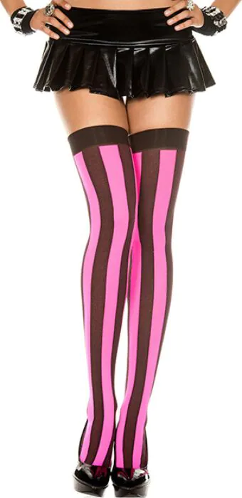 Dessa randiga strumpbyxor från Music Legs med vertikala svarta och rosa band framhäver silhuetten på ett lekfullt sätt. för kvällar eller modiga looks på dagen; inte för den som föredrar nästan osynliga strumpor.