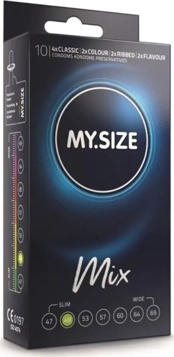 Paketet med MY SIZE MIX innehåller 10 kondomer i fyra variationer: 4 Klassiska, 2 Räfflade, 2 Smak och 2 Färg, vilket ger mångsidighet för olika preferenser.