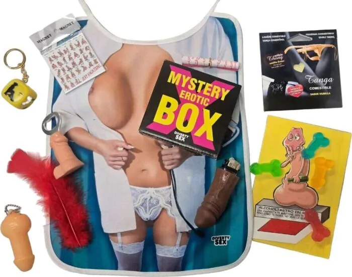 Varje Mystery Box innehåller en blandning av novelty skämtföremål, lätt erotiska artiklar och lekfulla tillbehör. Förvänta dig överraskningar som klistermärken, skämtkort och blandade lekverktyg.