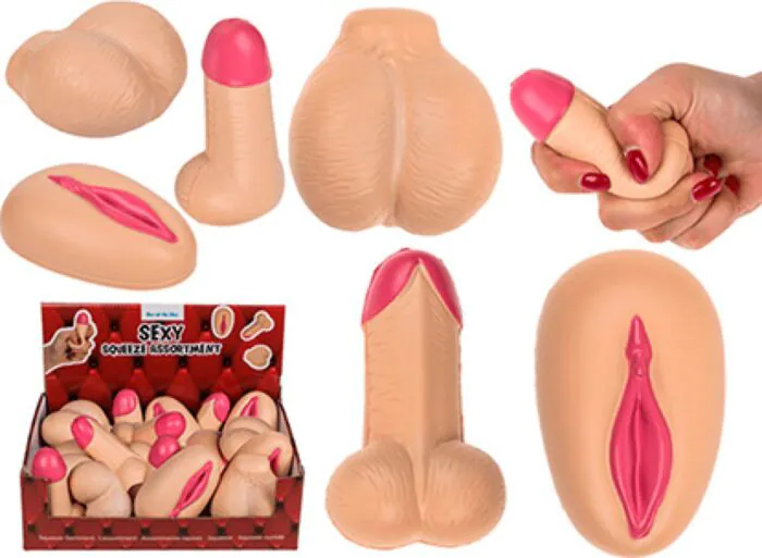 Om du vill ha ett subtilt och skojigt sätt att lindra spänningar eller ge bort på vuxenfester, är SQUEEZE SURTIDO precis vad du söker. Det är ett sortiment av pruttbara nyheter i form av penisar, vulvor och testiklar - ett paket med 12 delar inklusive 4 av varje design, i vaniljetoner med rosa detaljer och realistiska ytor.
