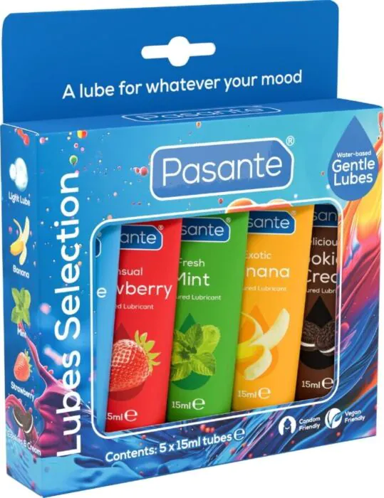 Det här mini-paketet från Pasante innehåller fem vattenbaserade, smaksatta glidmedel i 15ml tuber. för att prova olika smaker, för att ha något diskret i väskan, eller för att addera lekfull smak till oral intimitet. Säker för kondomer och sexleksaker, vegansk och fri från parabener – ett praktiskt val för par och resenärer.