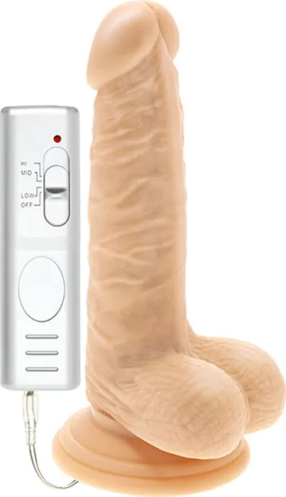 En realistisk vibrator med ådring och kraftig sugbas. Utrustad med sladdkontroll och tre vibrationslägen, utformad för att ge en ordentlig upplevelse.