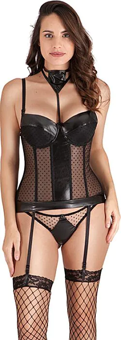 Detta modeinriktade fyra-delars set riktar sig mot dig som vill ha ett helt koordinerat utseende utan att behöva leta efter separata delar. Du får en bustier med underwire och integrerad garter, en matchande trosa med dekorativ rosett, en avtagbar nackaccessoar för att framhäva dekolletaget och nätstrumpor med spetskant. Den sammanlagda finishen är semitransparent med prickigt mönster och detaljer i fusk skinn för en lite edgy stil.