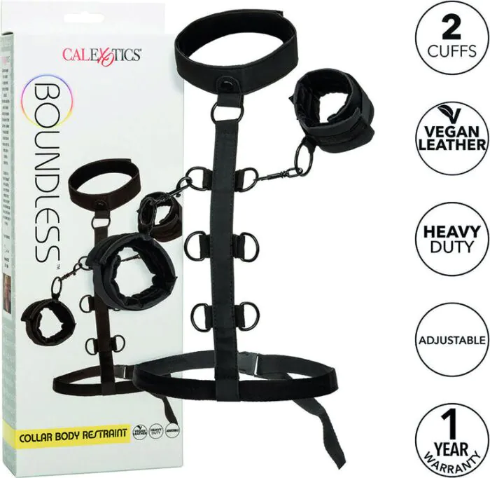 Upplev spännande bondage med CalExotics Boundless Collar. Detta mångsidiga restraintsystem med veganläderhandbojor passar både nybörjare och entusiaster, och erbjuder justerbara alternativ för sensuella äventyr tillsammans.