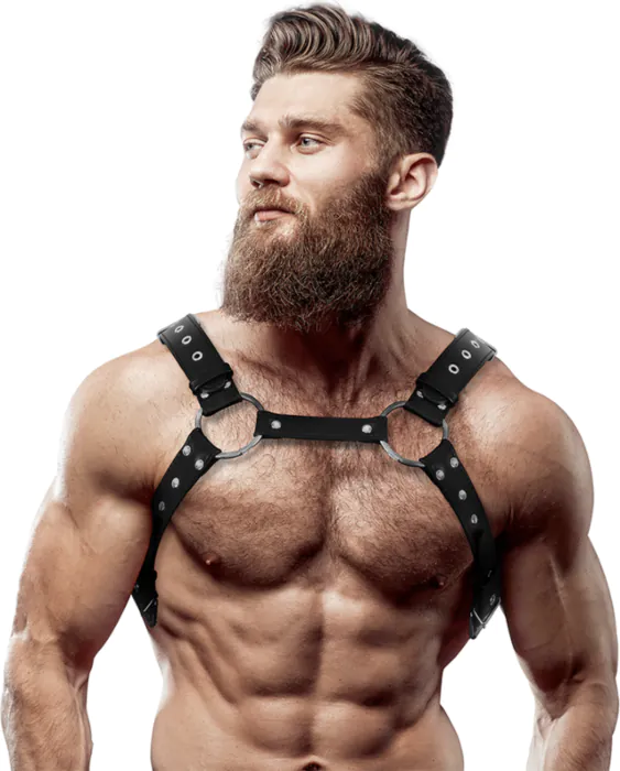 Höj din stil med denna eleganta sele i ekoläder som framhäver den manliga formen. För dem som vill tillföra en vågad detalj i sin klädsel.