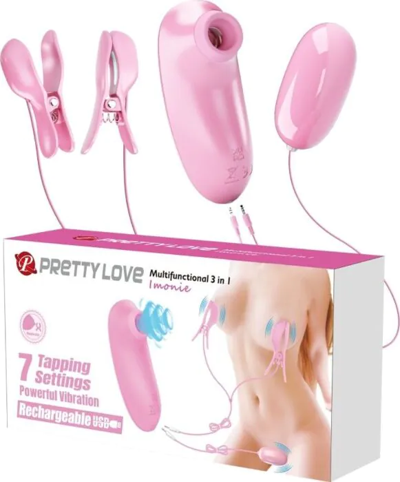 Pretty Love Imonie-setet är designat för att ge en spännande blandning av stimulering i dina intima stunder. Med 7 knackningslägen och individuella vibrationsinställningar för varje bröstvårtsklämma, samt en liten men kraftfull vibrerande bullet, ger detta set möjlighet till skräddarsydd njutning som du och din partner enkelt kan styra.