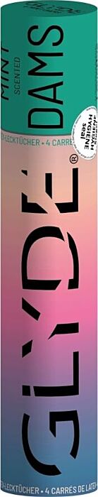 SHEER GLYDE Dams är silkeslena, tunna latexark med mintdoft, som levereras i ett paket med fyra engångsark. De ger en portabel barriär för oral, vaginal eller anal kontakt.