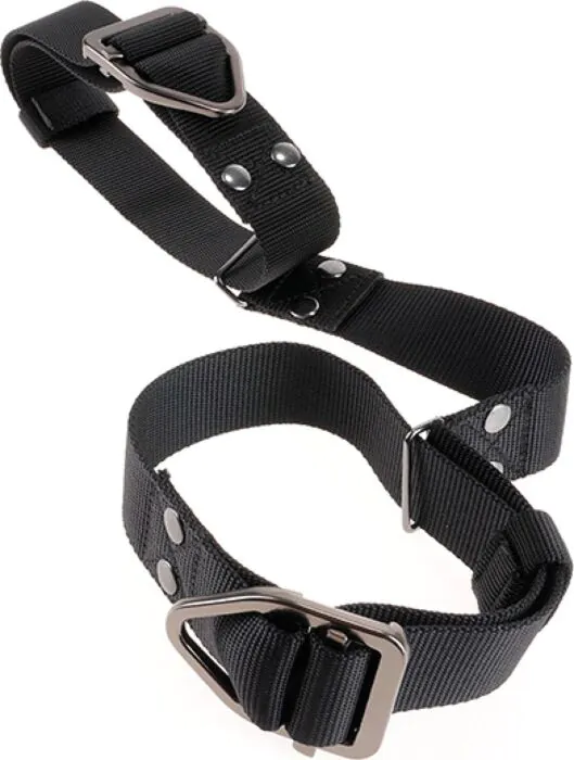 Detta är en robust bicep binder som är utformad för säker armavskärmning under partnerlek. Tänk på det som två starka remmar som sveper runt varje överarm, åtdragna med rostfria spännen och fästa vid en V-formad ring som ger bättre riktad kontroll och minskar risken för att glida eller rulla.