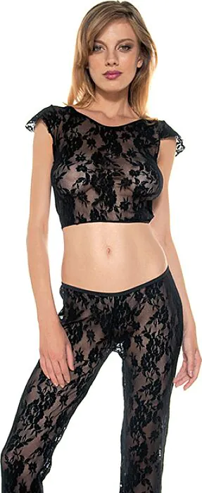 Ett svart spets tvådelat set från Music Legs: en topp med små ärmar i kombination med matchande byxor. Lätt och andningsbart, för den som vill ha ett delikat och enkelt bärbart set.