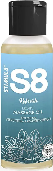Detta är en kroppsmassageolja från STIMUL8:s S8-serie, med doften Refresh — fransk plommon kombinerat med egyptisk bomull. Det är en trippeloljeblandning (sesam, söt mandel och jojoba) som berikats med vitaminer och mineraler, vilket ger en närande känsla på huden snarare än bara oljig.