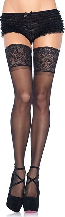 Gå in i elegans med dessa svarta strumpor som når låren, komplett med vacker bred spets som ger en sensuell kant. Tillverkade av 85% polyamid och 15% spandex, erbjuder de en bekväm men åtsittande passform som säkerställer att de sitter på plats hela dagen.