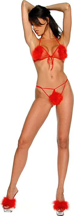 Ett lekfullt trosor och behå-set från Music Legs, dekorerat med röda fjäderpom-poms. för boudoirmoments; välj detta om du vill ha ett lätt, flirtigt set för särskilda tillfällen.