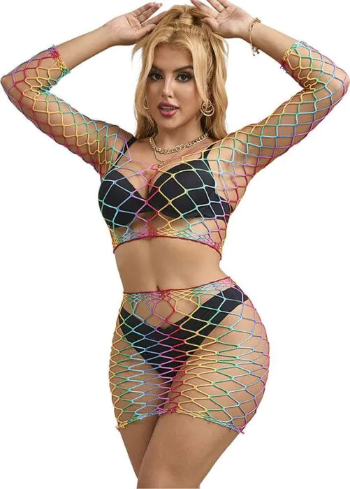 Detta tvådelade fishnet lingerie set har ett färgstarkt regnbågsmönster, som förenar stil och komfort för dig som vill synas. Passar utmärkt för speciella tillfällen eller utekvällar.